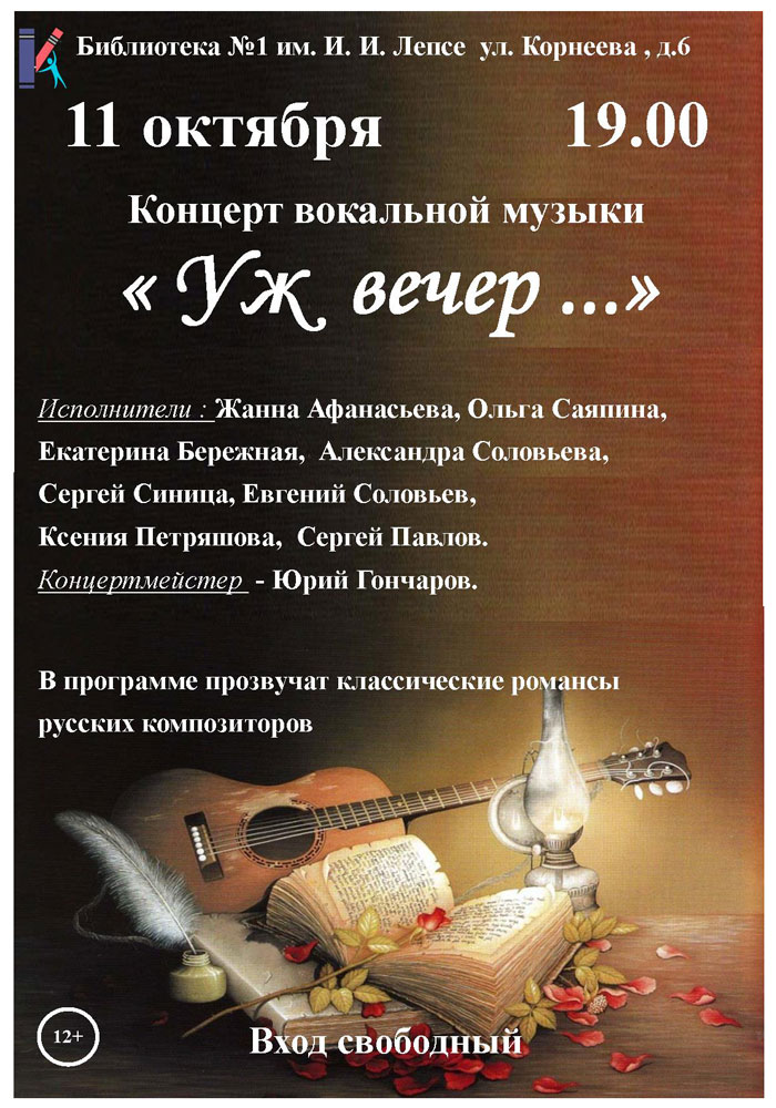 Библиотека №1 им. И. И. Лепсе приглашает всех желающих 11 октября в 19.00 на Концертную программу "Уж вечер...", в исполнении вокального класса Жанны Афанасьевой.
