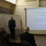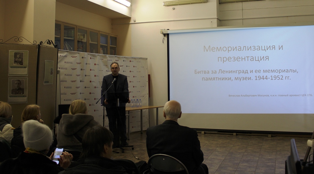 Во втором докладе историк Вячеслав Альбертович Мосунов рассказал о первых памятниках и мемориалах возведённых в память об обороне Ленинграда в течение 10 лет после событий. В фокусе доклада была и судьба первого музея в Соляном переулке и мемориала "Свирская победа".