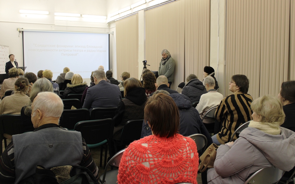 В первом докладе художник Татьяна Баронова рассказала о своей бабушке, актрисе и голосе ленинградского радио в годы блокады. Рассказ сопровождался демонстрацией материалов из семейного архива. Мария Петрова, будучи актрисой, сыграла во время блокады в около ста спектаклях, в том числе перед защитниками города.