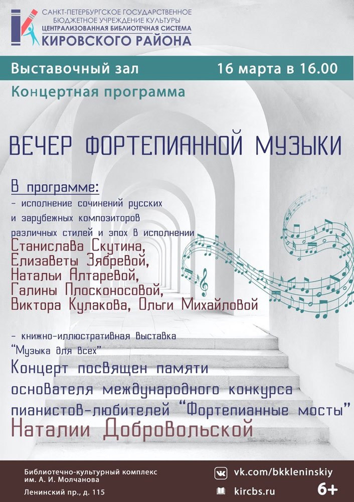 16 марта в 16.00 в Выставочном зале Библиотечно-культурного комплекса им. А. В. Молчанова (Ленинский пр., д. 115) состоится Концертная программа "Вечер фортепианной музыки".