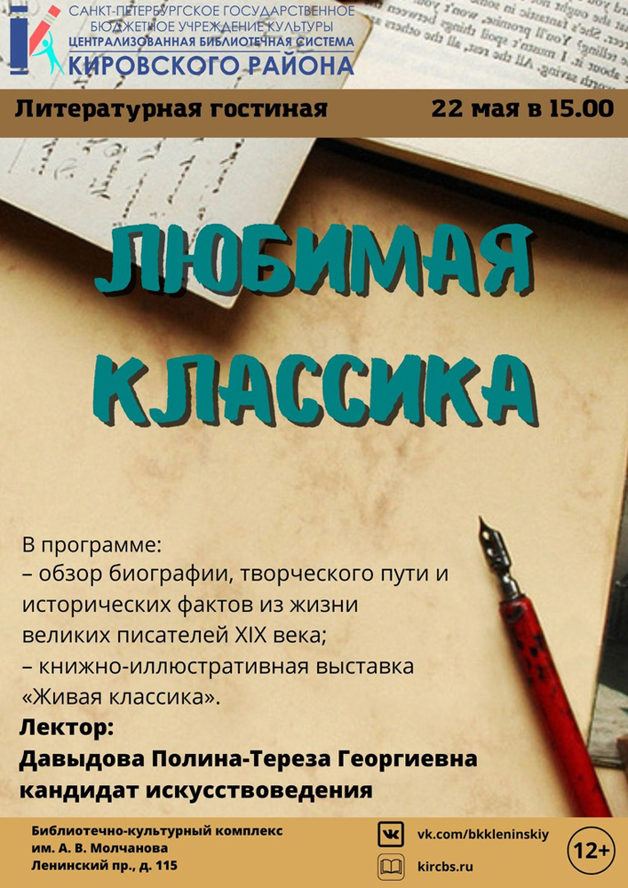 22 мая в 15.00 в Литературной гостиной Библиотечно-культурного комплекса им. А. В. Молчанова (Ленинский пр., д. 115) состоится Лекция "Любимая классика".