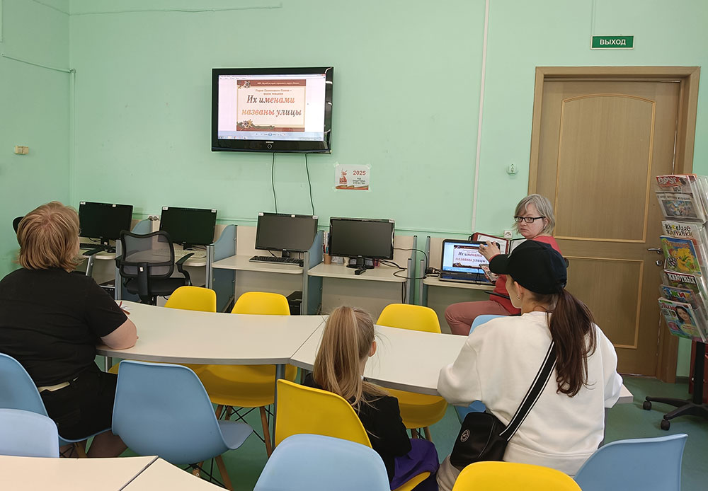 Краеведческое занятие "Их именами названы" было посвящено нескольким улицам района, которые находятся вблизи Библиотеки №8. Выставка "Вспомним всех поименно" сопровождала информационную презентацию "Улицы Кировского района".