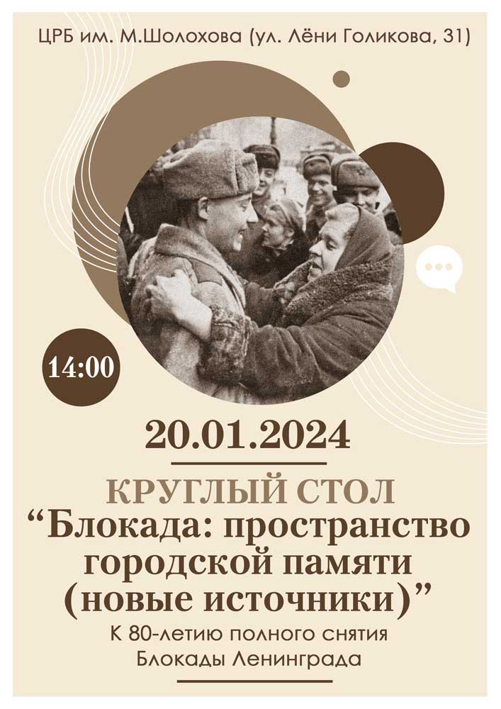20 января 2024 года в 14.00 в Центральной районной библиотеке им. М. Шолохова СПб ГБУК "ЦБС Кировского района" (ул. Лени Голикова, д. 31) состоится круглый стол "Блокада: пространство городской памяти (новые источники)". Мероприятие проводится в рамках профессиональной программы межмузейного форума Санкт-Петербурга "Дневные звезды" в память 80-летия полного снятия Блокады Ленинграда.