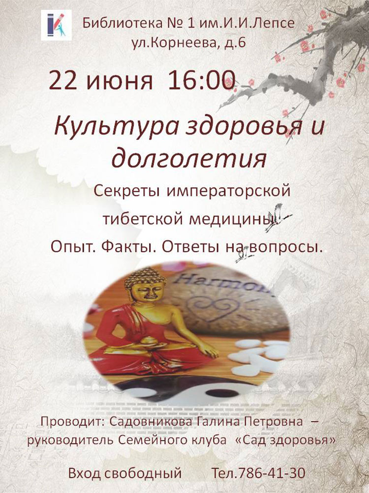 Библиотека №1 им. И. И. Лепсе приглашает на Беседу "Культура здоровья и долголетия: Секреты императорской тибетской медицины. Опыт. Факты. Ответы на вопросы".