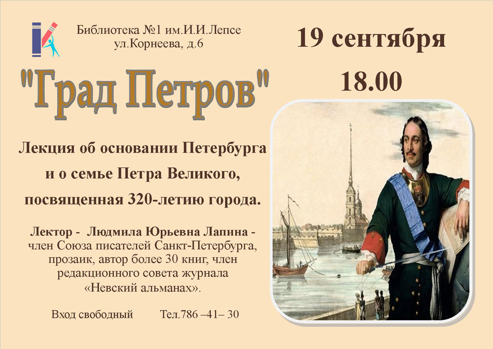 Библиотека №1 им. И. И. Лепсе приглашает всех желающих на Лекцию "Град Петров", которая познакомит посетителей с историей основания Санкт-Петербурга и семьей Петра Великого. Данное мероприятие посвящено 320-летию города.