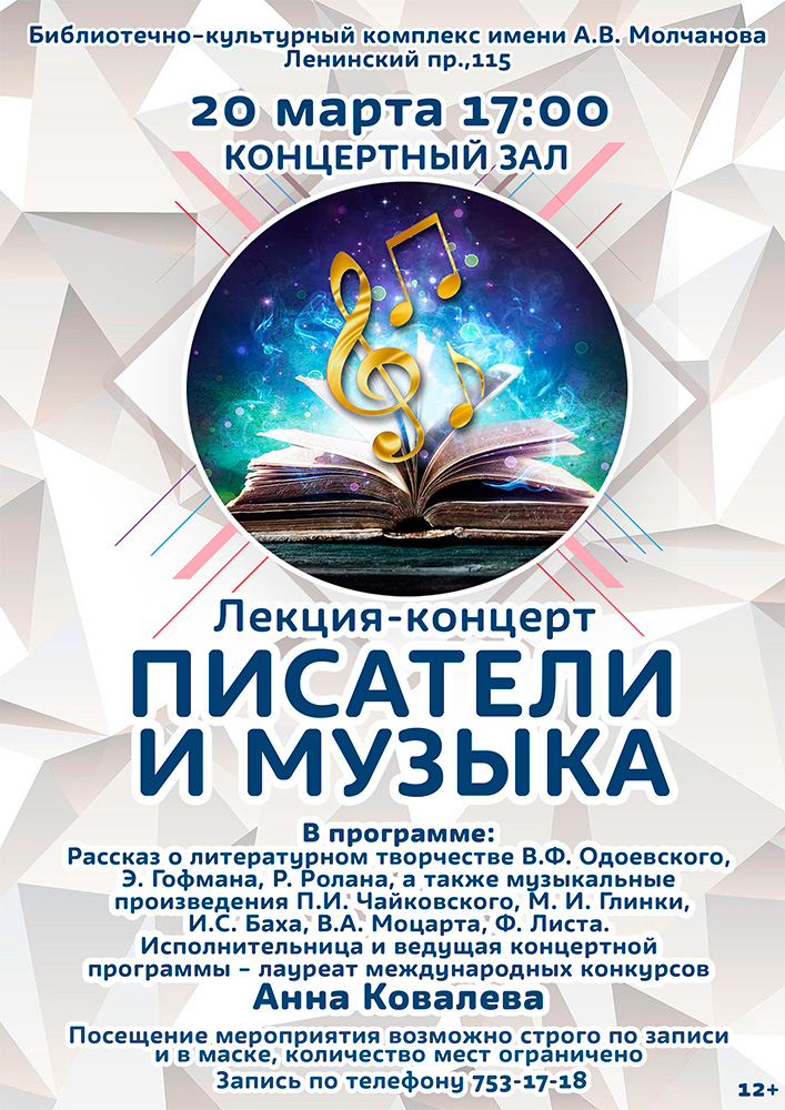 20 марта в 17.00 в Библиотечно-культурном комплексе им. А. В. Молчанова пройдет Лекция-концерт "Писатели и музыка".