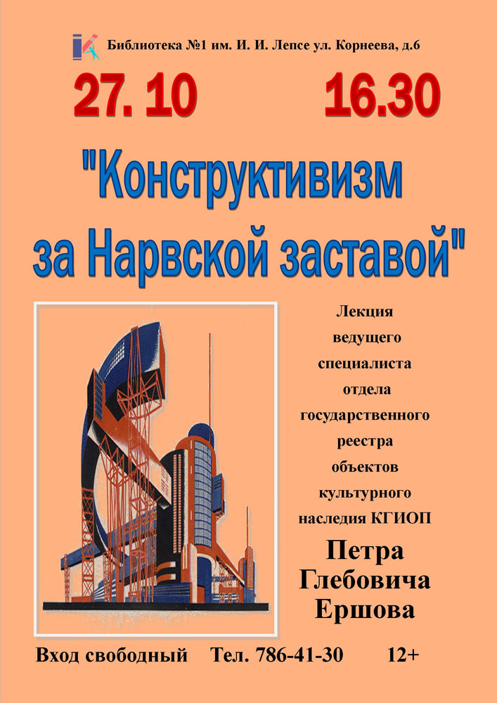 Библиотека №1 им. И. И. Лепсе приглашает всех желающих 27 октября в 16.30 на Лекцию "Конструктивизм за Нарвской заставой".