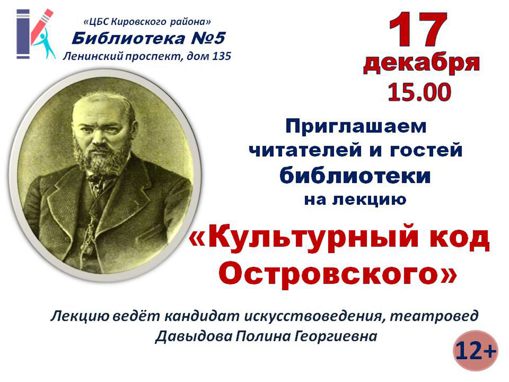 Читателей и гостей библиотеки ожидает увлекательная лекция кандидата искусствоведения и театроведа Полины Георгиевны Давыдовой на тему творчества Островского и поиска культурного кода писателя.
