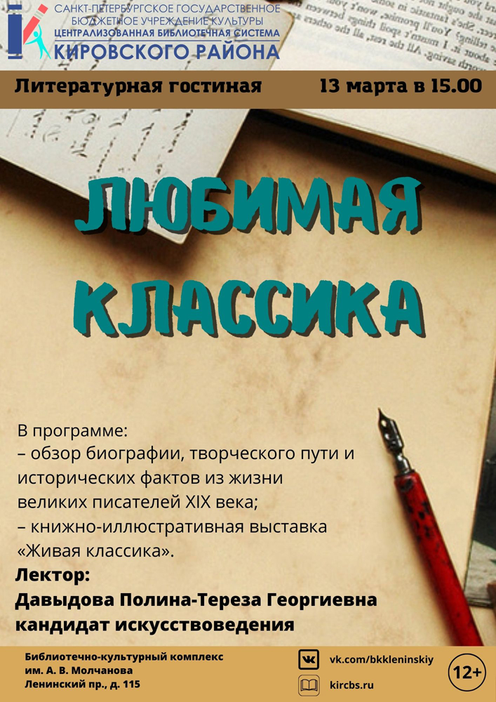 13 марта в 15.00 в Литературной гостиной Библиотечно-культурного комплекса им. А. В. Молчанова (Ленинский пр., д. 115) состоится Лекция "Любимая классика".