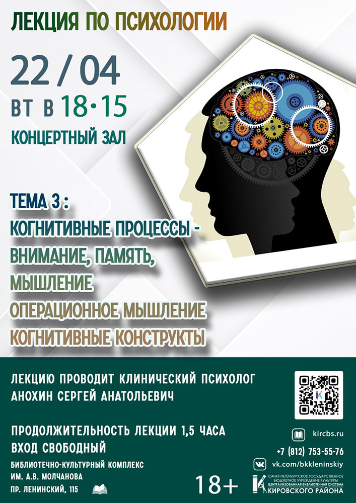 22 апреля в 18.15 в Концертном зале Библиотечно-культурного комплекса им. А. В. Молчанова (Ленинский пр., д. 115) состоится лекция по психологии. Тема №3: "Когнитивные процессы - внимание, память, мышление. Операционное мышление. Когнитивные конструкты".