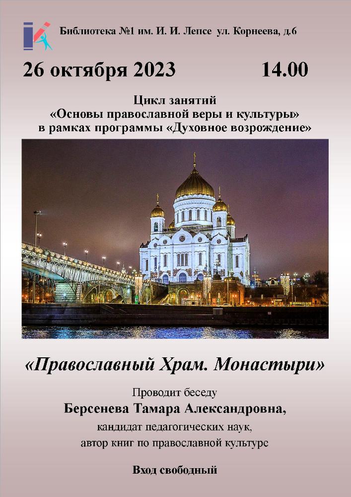 26 октября 2023 г. в 14.00 Библиотека №1 им. И. И. Лепсе приглашает на лекцию "Православный храм. Монастыри" в рамках программы "Духовное возрождение. Основы православной веры и культуры".