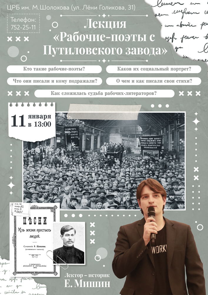 Библиотека имени М. Шолохова приглашает читателей на первую в этом году краеведческую Лекцию "Рабочие-поэты с Путиловского завода" с историком Егором Мишиным. На лекции речь пойдет о феномене поэтов-рабочих с Путиловского завода.
