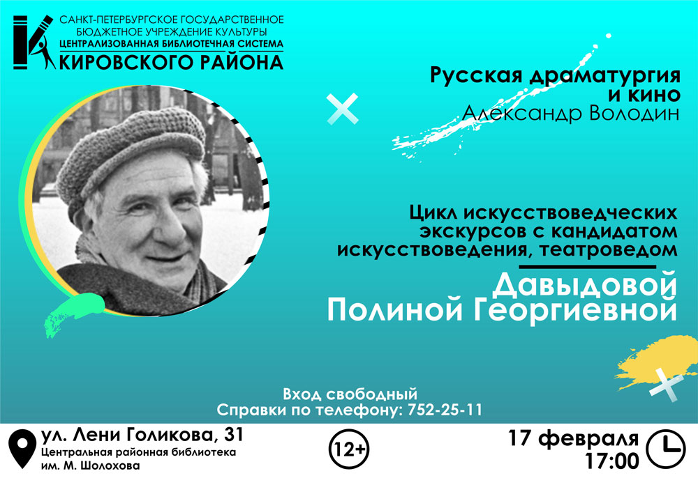 17 февраля 2023 года в 17.00 в Центральной районной библиотеке им. М. А. Шолохова ЦБС Кировского района Санкт-Петербурга в рамках цикла "Русская драматургия и кино" состоится творческая встреча с кандидатом искусствоведения, театроведом, директором Международного Суворовского патриотического фестиваля искусств Давыдовой Полиной Георгиевной с лекцией: "Русская драматургия и кинематограф. Александр Володин".