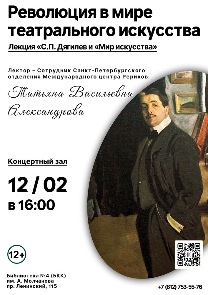 12 февраля в 16.00 в Концертном зале Библиотеки №4 (БКК) им. А. Молчанова (Ленинский пр., д. 115) состоится Лекция "С.П. Дягилев и "Мир искусства".
