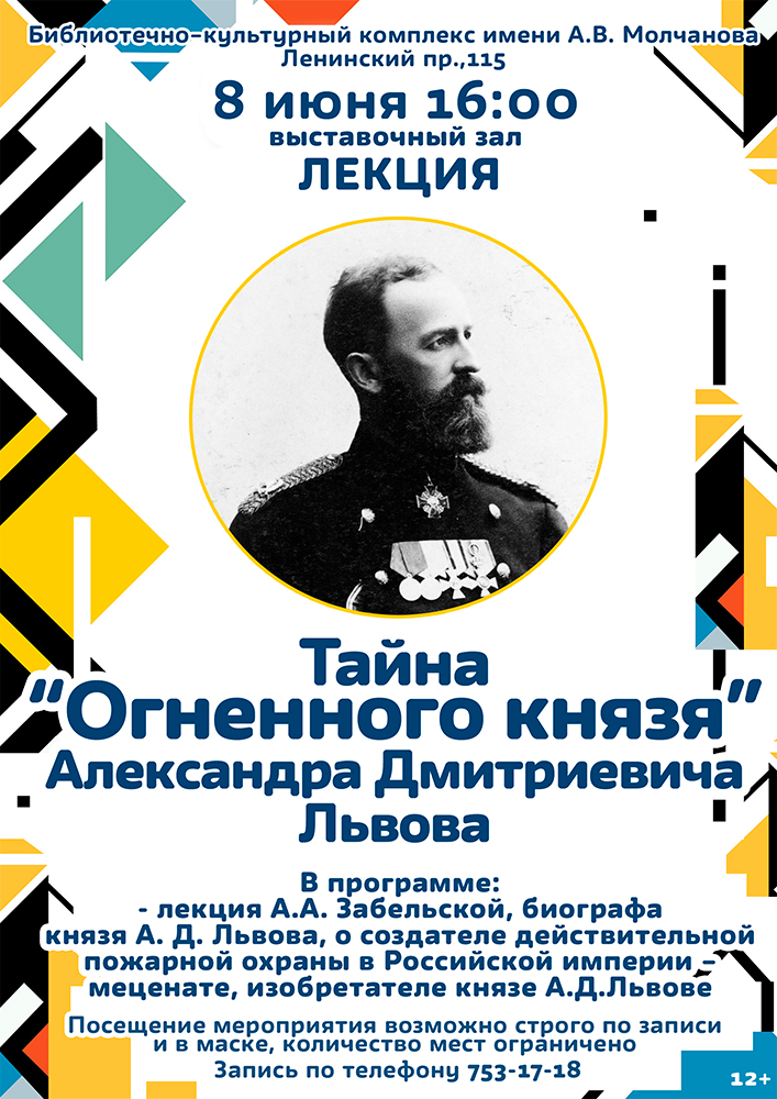 8 июня в 16.00 в выставочном зале Библиотеки №4 (Библиотечно-культурный комплекс) имени А. В. Молчанова пройдет лекция о создателе действительной пожарной охраны в Российской империи - меценате, изобретателе князе А. Д. Львове "Тайна "Огненного князя" Александра Дмитриевича Львова".