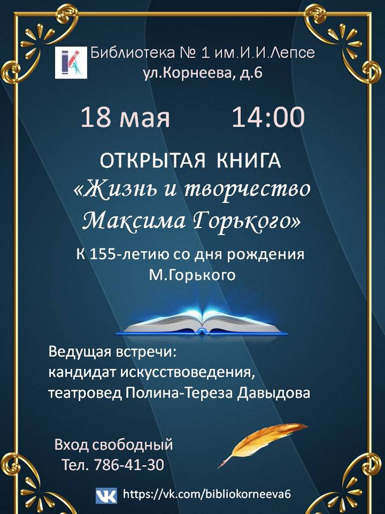 Библиотека №1 им. И. И. Лепсе приглашает на Проект "Открытая книга": "Жизнь и творчество Максима Горького", к 155-летию со дня рождения писателя.