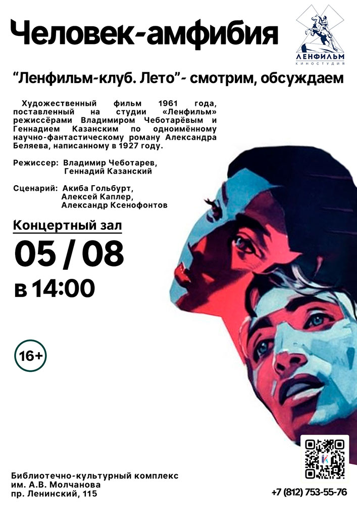 5 августа в 14.00 в Концертном зале Библиотечно-культурного комплекса им. А. В. Молчанова (Ленинский пр., д. 115) состоится кинопоказ "Ленфильм-клуб. Лето" - смотрим, обсуждаем "Человек-Амфибия".