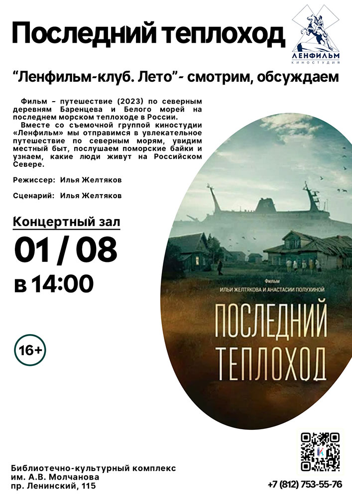 1 августа в 14.00 в Концертном зале Библиотечно-культурного комплекса им. А. В. Молчанова (Ленинский пр., д. 115) состоится кинопоказ "Ленфильм-клуб. Лето" - смотрим, обсуждаем "Последний теплоход".