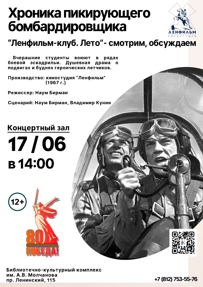 17 июня в 14.00 в Концертном зале Библиотечно-культурного комплекса им. А. В. Молчанова (Ленинский пр., д. 115) состоится встреча любителей кино: "Ленфильм-клуб. Лето - смотрим, обсуждаем": "Хроника пикирующего бомбардировщика".