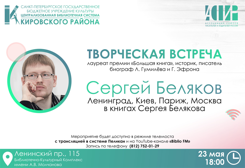 23 мая в 18.00 в Библиотечно-культурном комплексе имени А. В. Молчанова на Ленинском проспекте, 115, состоится творческая встреча с писателем, историком, литературным критиком, биографом Л. Гумилёва и Георгия Эфрона, исследователем национальной идентичности, лауреатом Национальной литературной премии "Большая книга" Сергеем Беляковым.