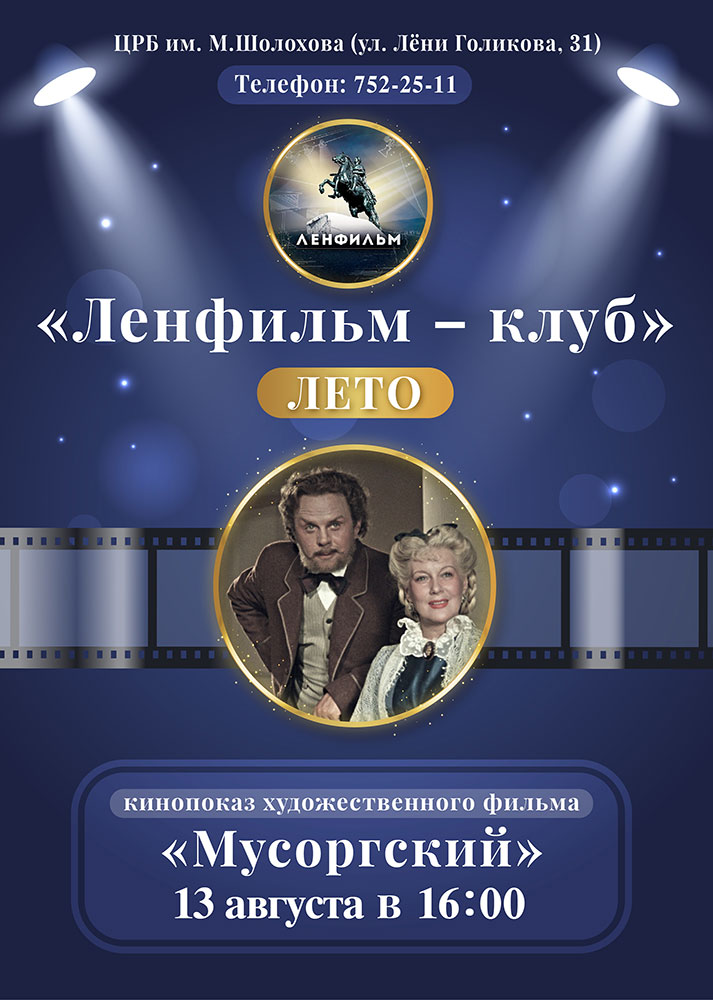 13 августа в 16.00 в Центральной библиотеке им. М. Шолохова в рамках проекта "Ленфильм-клуб. Лето" пройдет кинопоказ фильма "Мусоргский".