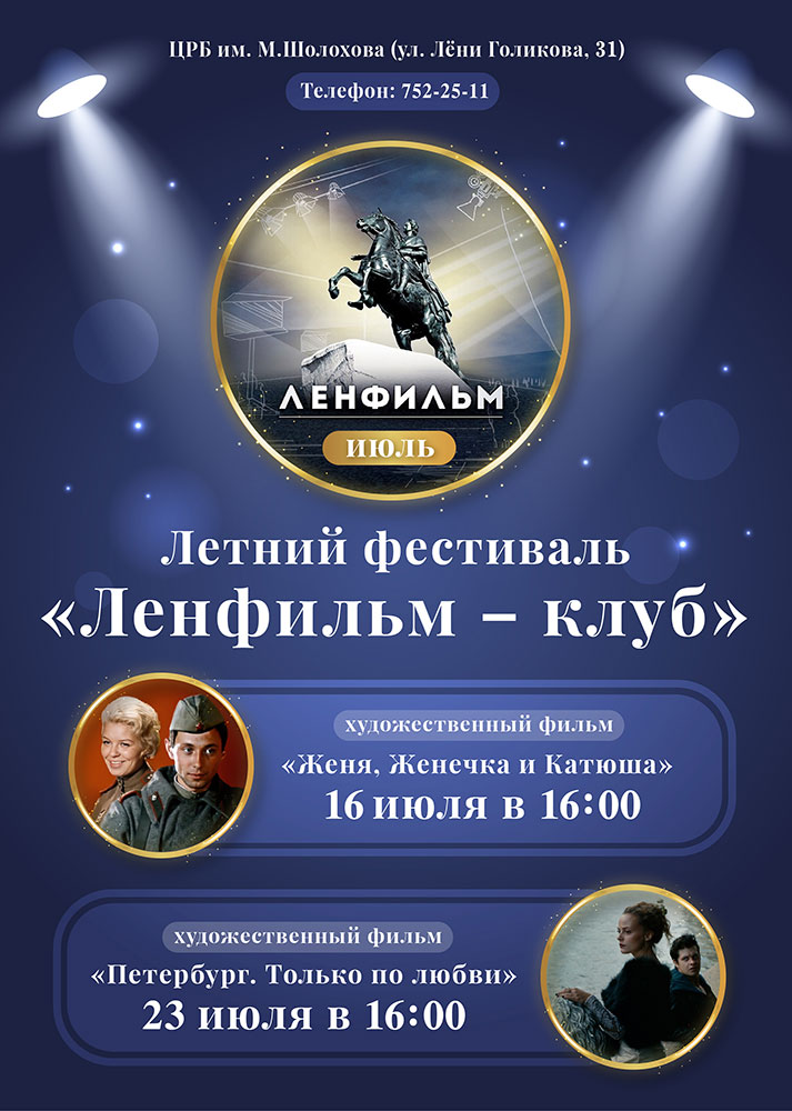 23 июля в 16.00 в Центральной библиотеке им. М. Шолохова в рамках проекта "Ленфильм-клуб. Лето" пройдет кинопоказ фильма "Петербург. Только по любви".
