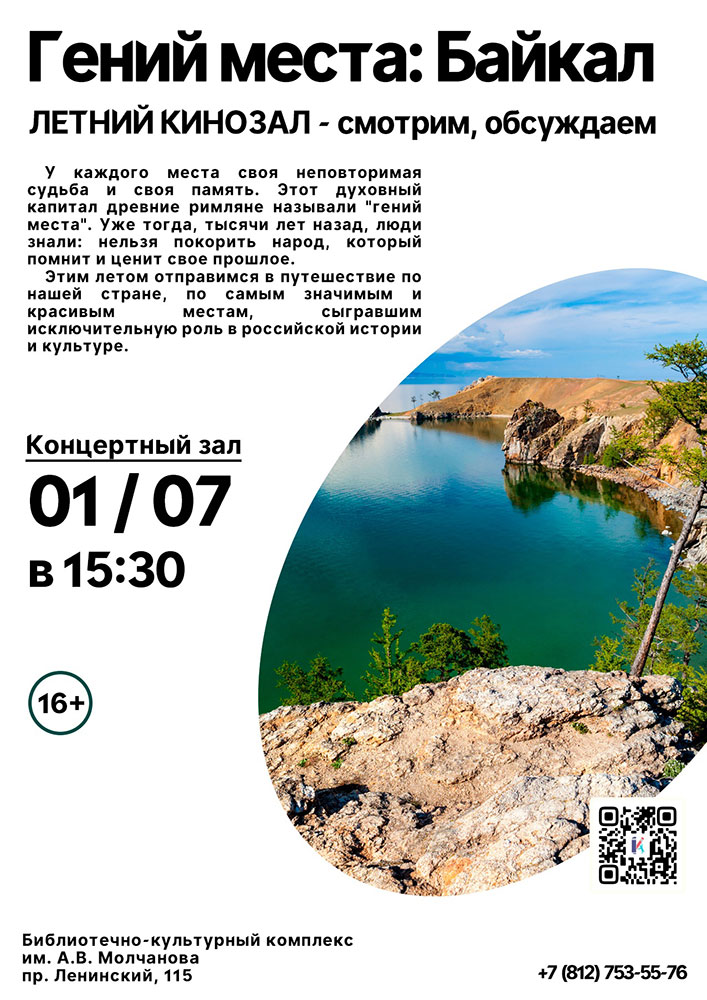1 июля в 15.30 в Концертном зале Библиотечно-культурного комплекса им. А. В. Молчанова (Ленинский пр., д. 115) состоится Летний кинозал - смотрим, обсуждаем "Гений места - Байкал".
