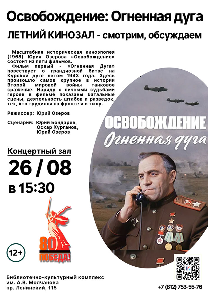 26 августа в 15.30 в Концертном зале Библиотечно-культурного комплекса им. А. В. Молчанова (Ленинский пр., д. 115) состоится Летний кинозал - смотрим, обсуждаем "Курская дуга".