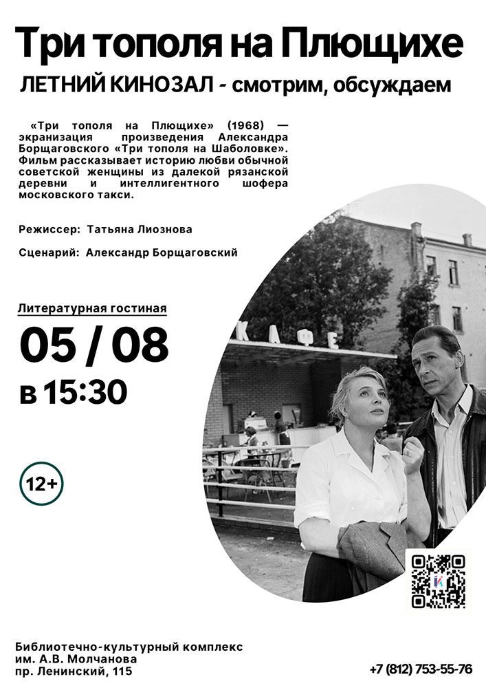 Дорогие друзья! Приглашаем вас на кинопоказ советского чёрно-белого мелодраматического фильма "Три тополя на Плющихе" (1968) - экранизации произведения Александра Борщаговского "Три тополя на Шабаловке".