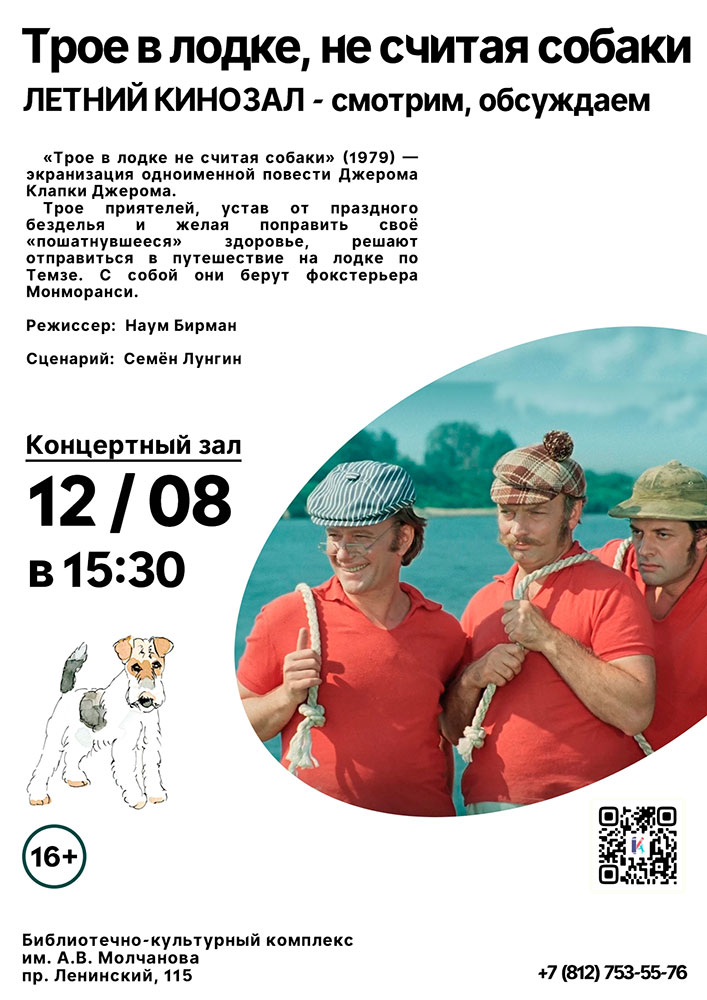 12 августа в 15.30 в Концертном зале Библиотечно-культурного комплекса им. А. В. Молчанова (Ленинский пр., д. 115) состоится Летний кинозал - смотрим, обсуждаем "Трое в лодке, не считая собаки".