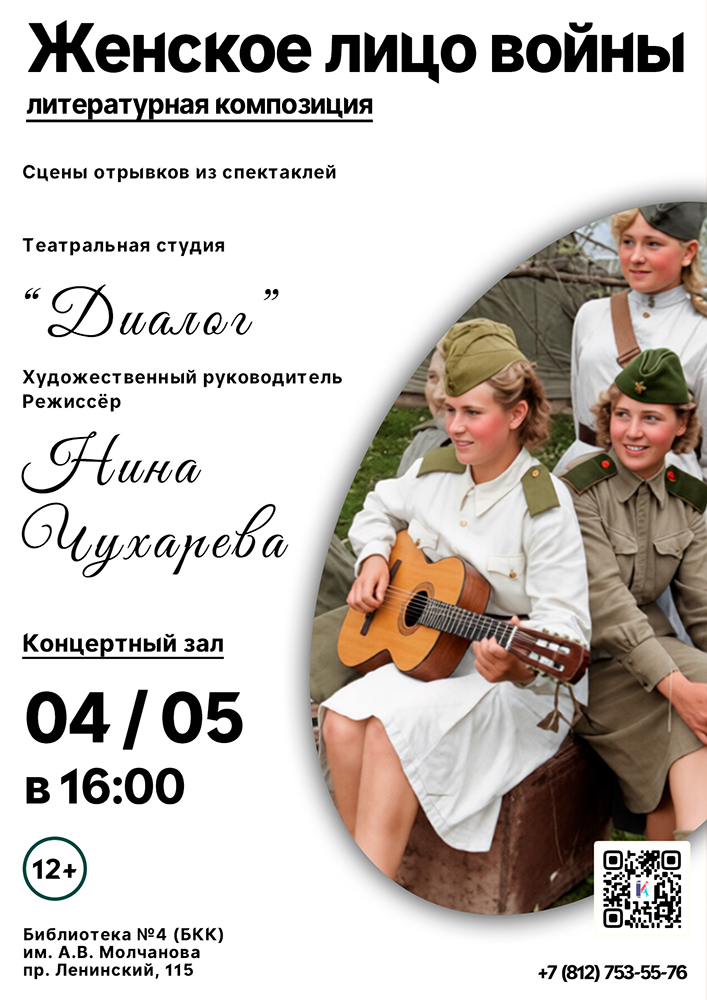 4 мая в 16.00 в концертном зале Библиотеки №4 (Библиотечно-культурного комплекса) им. А. В. Молчанова (Ленинский пр., д. 115) состоится Литературная композиция "Женское лицо войны".