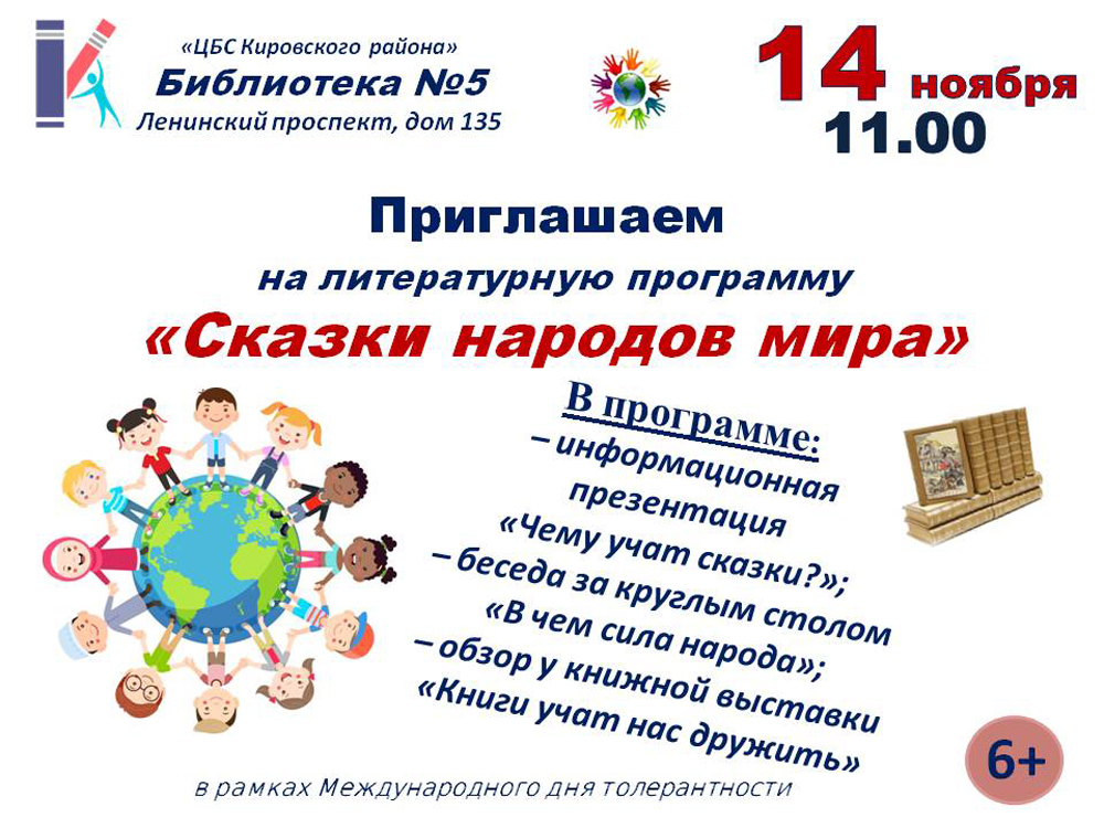 В преддверии Международного дня толерантности читателей и гостей библиотеки ожидает Литературная программа "Сказки народов мира", в рамках которой будет представлена информационная презентация "Чему учат сказки?" Все желающие смогут принять участие в беседе "В чем сила народа" по сохранению народного эпоса.