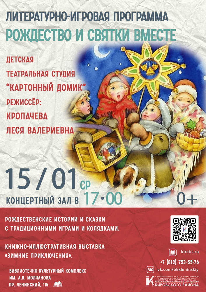 15 января в 17.00 в Концертном зале Библиотечно-культурного комплекса им. А. В. Молчанова (Ленинский пр., д. 115) состоится Тематическая программа "Рождество и святки вместе".