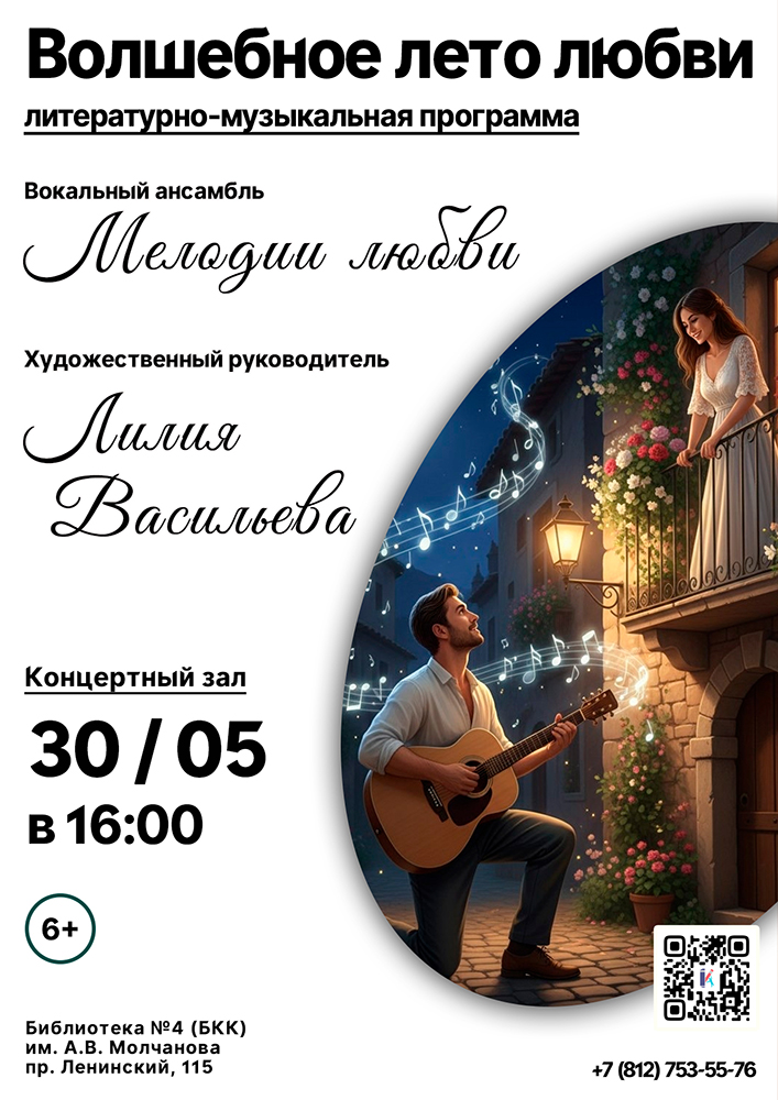 30 мая в 16.00 в Концертном зале Библиотеки №4 (Библиотечно-культурного комплекса) им. А. В. Молчанова (Ленинский пр., д. 115) состоится Литературно-музыкальная программа "Волшебное лето любви".