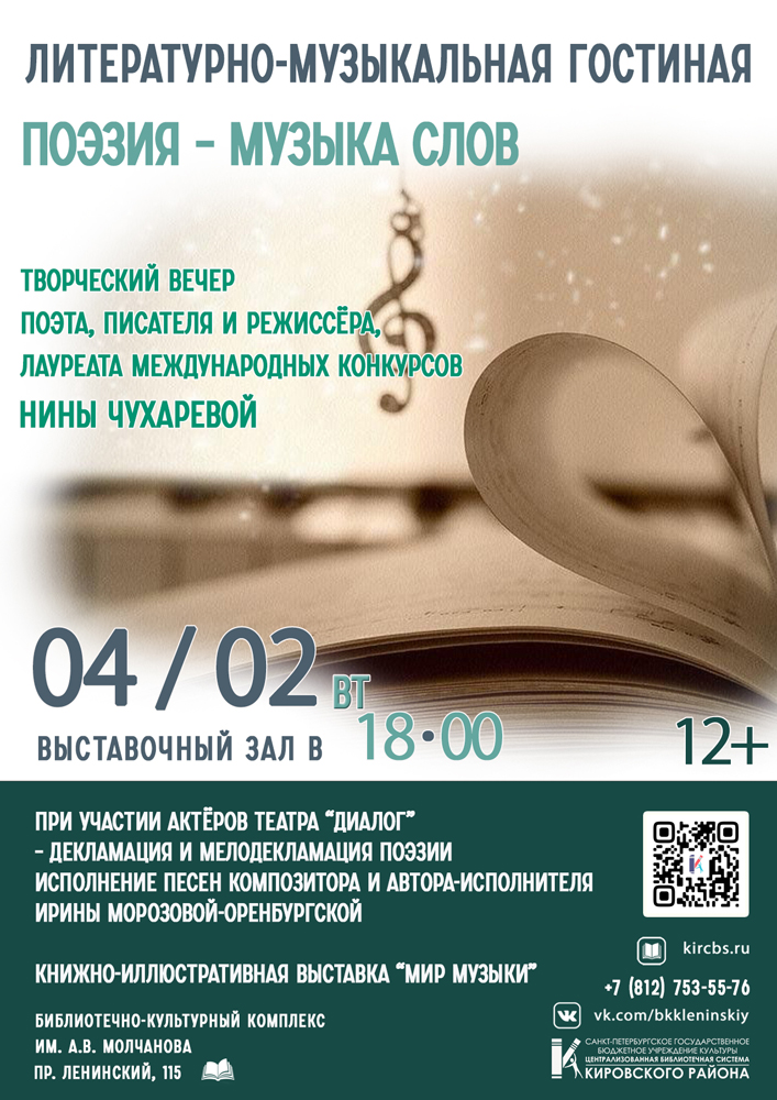 4 февраля в 18.00 в Выставочном зале Библиотечно-культурного комплекса им. А. В. Молчанова (Ленинский пр., д. 115) состоится Литературно-музыкальная гостиная "Поэзия - музыка слов".