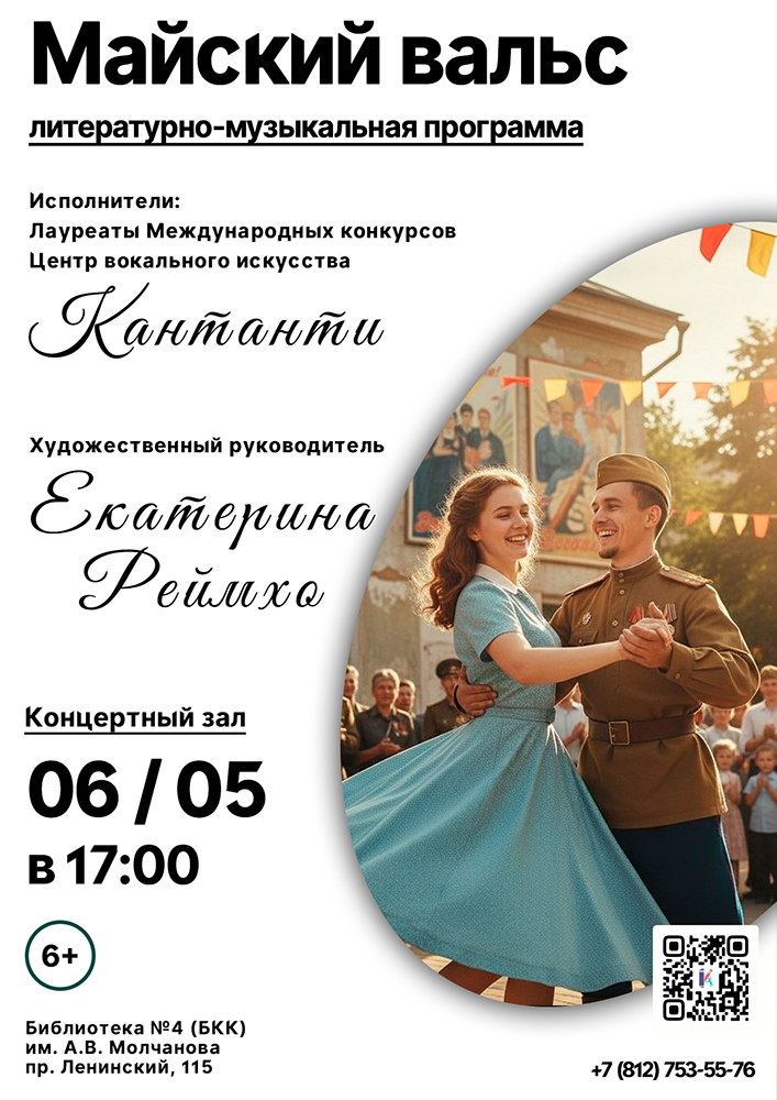 6 мая в 17.00 в концертном зале Библиотеки №4 (Библиотечно-культурного комплекса) им. А. В. Молчанова (Ленинский пр., д. 115) состоится Литературно-музыкальная композиция "Майский вальс".