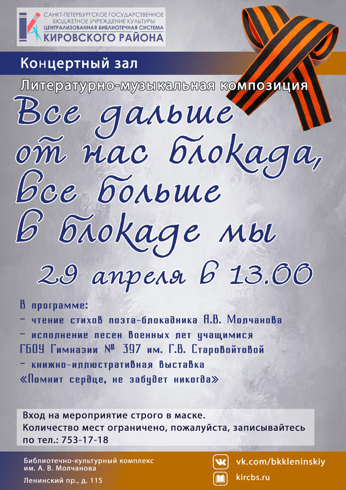 29 апреля в 13.00 в концертном зале Библиотечно-культурного комплекса им. А. В. Молчанова состоится Литературно-музыкальная композиция "Все дальше от нас блокада, все больше в блокаде мы", посвященная Дню Победы советского народа в Великой Отечественной войне 1941-1945 годов.