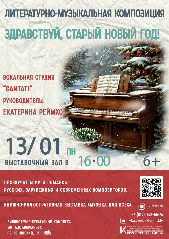 13 января в 16.00 в Выставочном зале Библиотечно-культурного комплекса им. А. В. Молчанова (Ленинский пр., д. 115) состоится Литературно-музыкальная композиция "Здравствуй, Старый Новый год!".