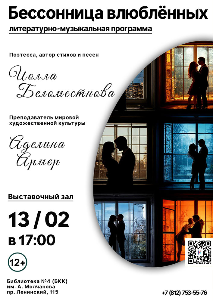 13 февраля в 17.00 в выставочном зале Библиотечно-культурного комплекса им. А. Молчанова (Ленинский пр., д. 115) состоится Литературно-музыкальная программа "Бессонница влюблённых".