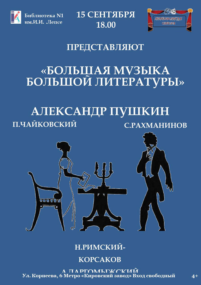 15 сентября Библиотека №1 им. И. И. Лепсе в содружестве с театром "Придворная опера" открывают новый цикл литературно-музыкальных программ под названием "Большая музыка большой литературы".