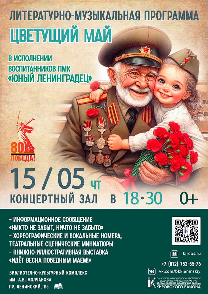 15 мая в 18.30 в Концертном зале Библиотечно-культурного комплекса им. А. В. Молчанова (Ленинский пр., д. 115) состоится Литературно-музыкальная программа "Цветущий май".