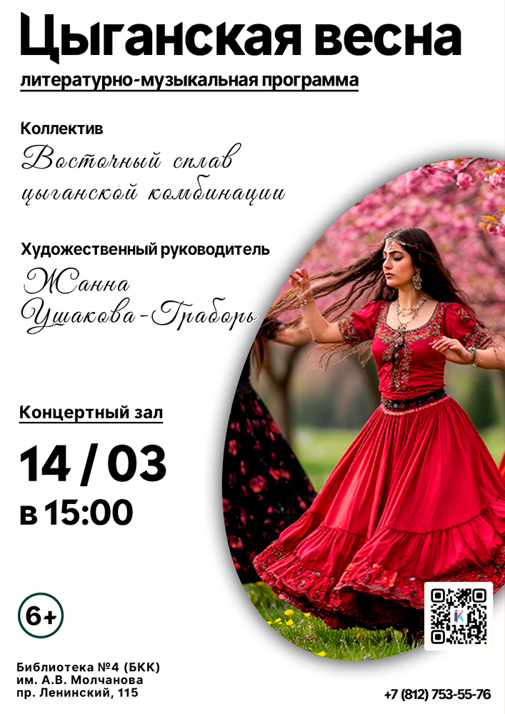14 марта в 15.00 в Концертном зале Библиотеки №4 (Библиотечно-культурного комплекса) им. А. В. Молчанова (Ленинский пр., д. 115) состоится Литературно-музыкальная программа "Цыганская весна".
