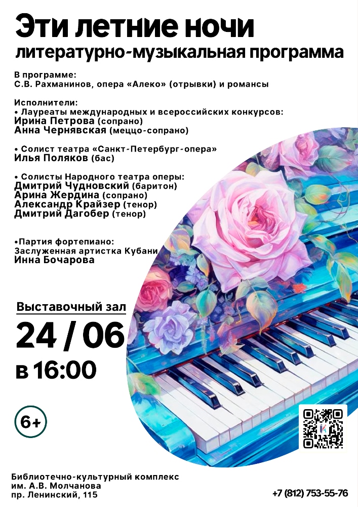 24 июня в 16.00 в Выставочном зале Библиотечно-культурного комплекса им. А. В. Молчанова (Ленинский пр., д. 115) состоится Литературно-музыкальная программа "Эти летние ночи".