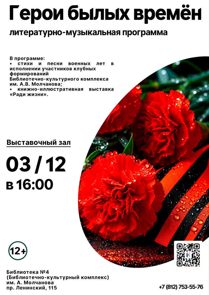 3 декабря в 16.00 в Выставочном зале Библиотеки №4 (Библиотечно-культурного комплекса) им. А. Молчанова (Ленинский пр., д. 115) состоится Литературно-музыкальная программа "Герои былых времён".