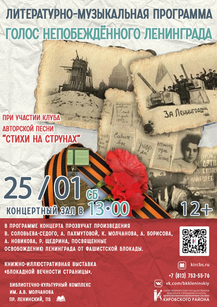 25 января в 13.00 в Концерном зале Библиотечно-культурного комплекса им. А. В. Молчанова (Ленинский пр., д. 115) пройдет Литературно-музыкальная программа "Голос непобеждённого Ленинграда" (12+).