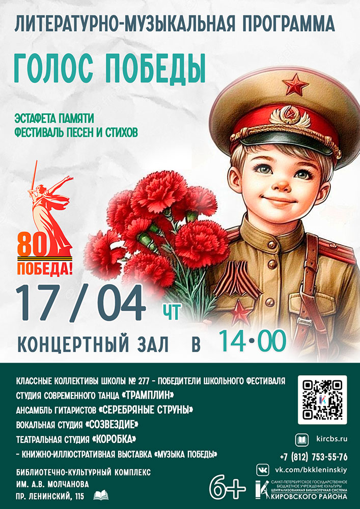 17 апреля в 14.00 в Концертном зале Библиотечно-культурного комплекса им. А. В. Молчанова (Ленинский пр., д. 115) состоится Литературно-музыкальная программа "Голос Победы".