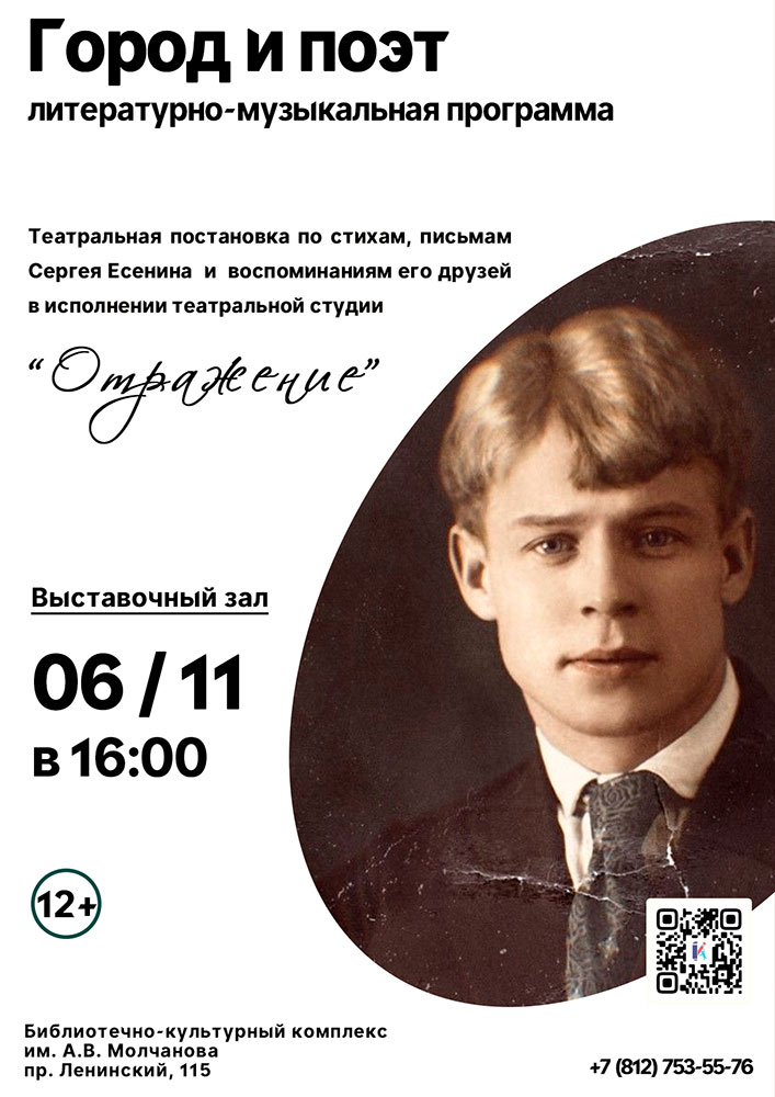 6 ноября в 16.00 в Выставочном зале Библиотечно-культурного комплекса им. А. В. Молчанова (Ленинский пр., д. 115) состоится Литературно-музыкальная программа "Город и поэт".