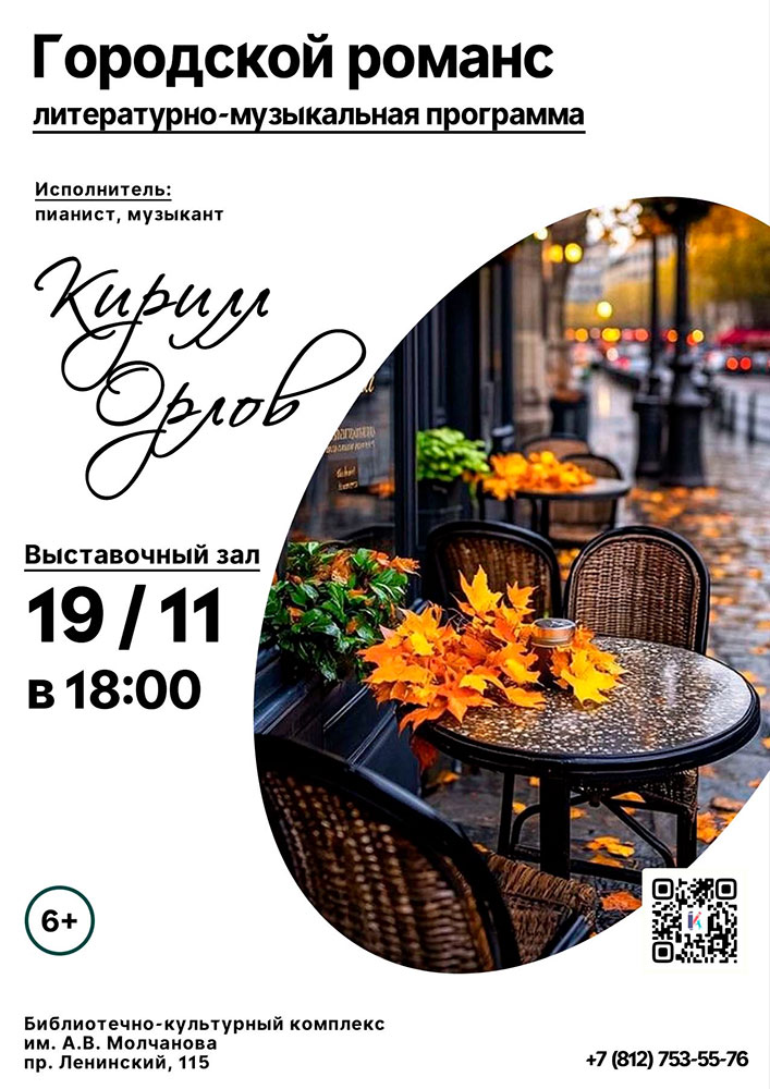19 ноября в 18.00 в выставочном зале Библиотечно-культурного комплекса им. А. В. Молчанова (Ленинский пр., д. 115) состоится Литературно-музыкальная программа "Городской романс".
