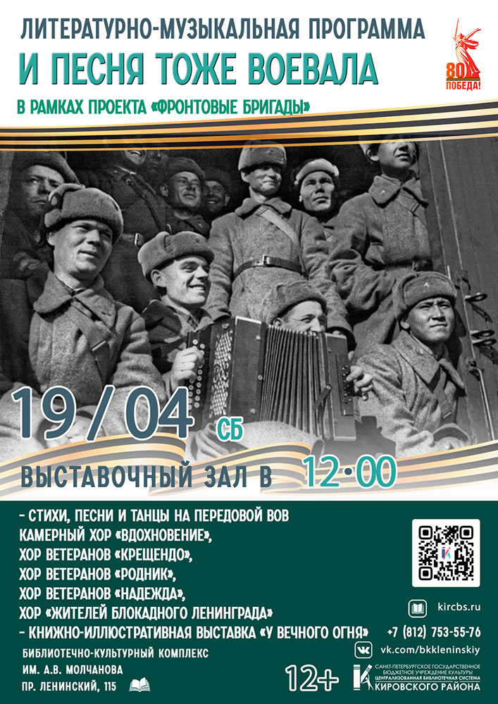 19 апреля в 12.00 в Концертном зале Библиотечно-культурного комплекса им. А. В. Молчанова (Ленинский пр., д. 115) состоится Литературно-музыкальная программа "И песня тоже воевала".
