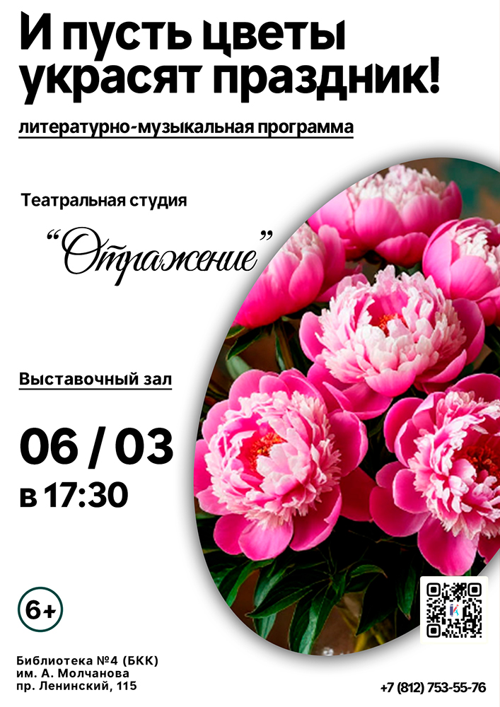 6 марта в 17.30 в Выставочном зале Библиотеки №4 (Библиотечно-культурного комплекса) им. А. В. Молчанова (Ленинский пр., д. 115) состоится Литературно-музыкальная программа "И пусть цветы украсят праздник!".